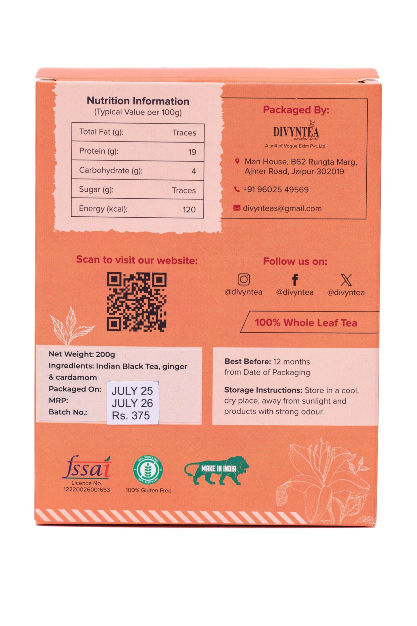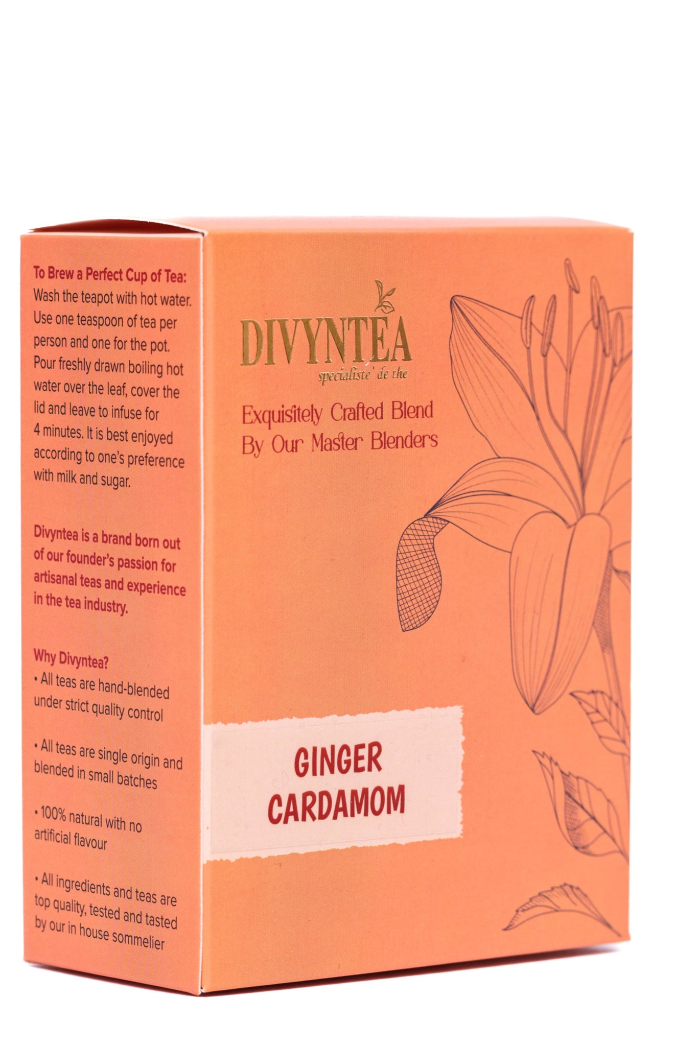 Taste: Boldly warming with ginger heat upfront, sweet cardamom mid-palate, and a clean tea finish