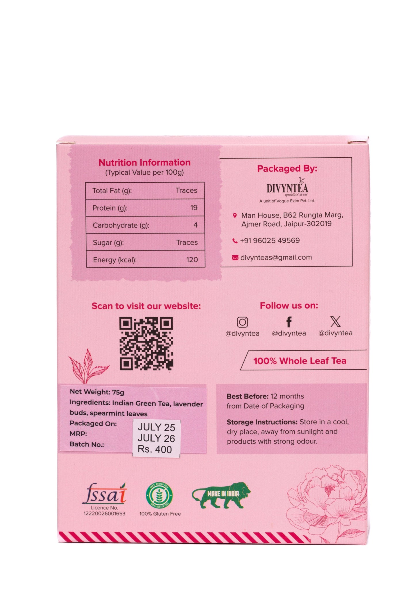 Some teas energise. This one invites you to pause, breathe, and unwind. Divyntea's Green Tea Lavender & Spearmint is a thoughtfully crafted calming blend that brings together the gentle antioxidant power of whole leaf green tea with the soothing, aromatherapy-grade fragrance of real lavender flowers and the cool, refreshing touch of spearmint leaves.